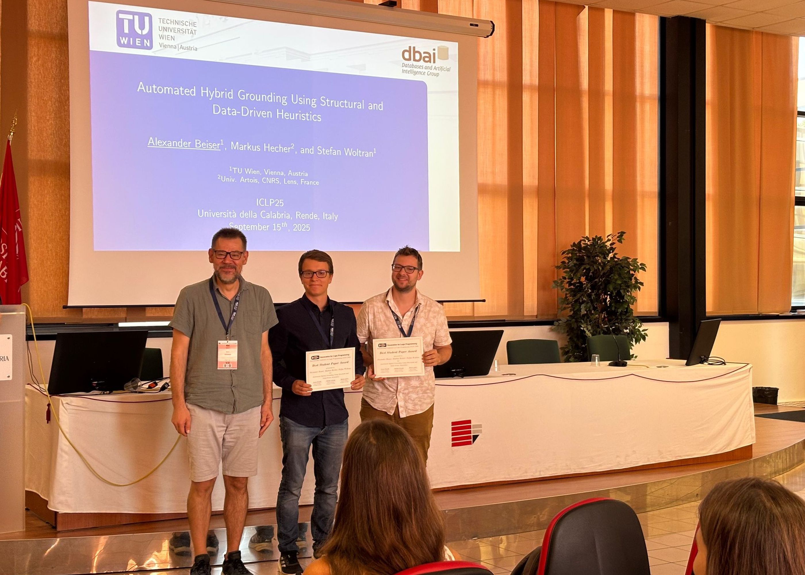 We’re excited to announce that Alexander Beiser (TU Wien - CAIML PhD Researcher), Markus Hecher (Univ. Artois, CNRS), and Stefan Woltran (TU Wien) won the Best Student Paper award at 41st International Conference on Logic Programming (ICLP 2025) in Rende, Italy on Automated Hybrid Grounding Using Structural and Data-Driven Heuristics.