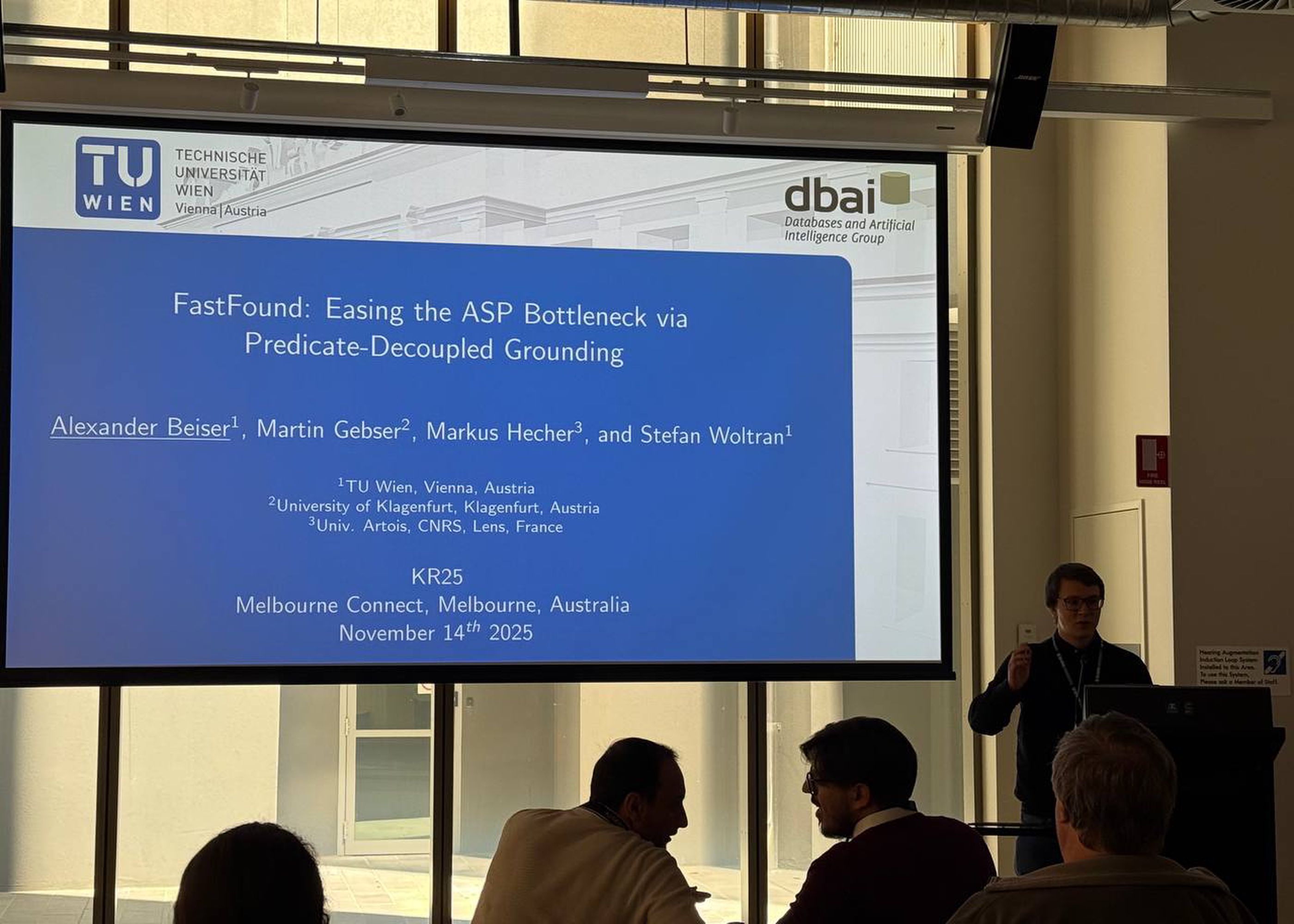 At KR 2025, the 22nd International Conference on Principles of Knowledge Representation and Reasoning held in Melbourne, Australia (11–17 November 2025), CAIML doctoral researcher Alexander Beiser presented the main-track paper “FastFound: Easing the ASP Bottleneck via Predicate-Decoupled Grounding” in the ASP session.